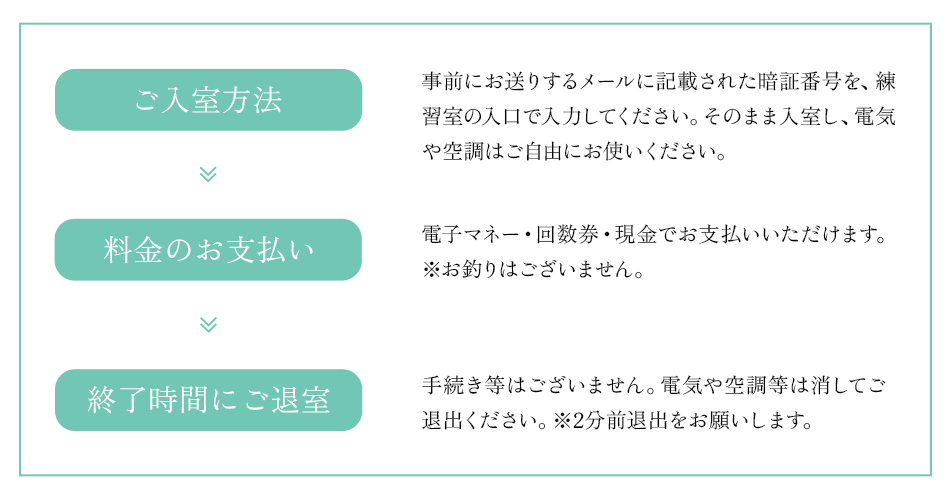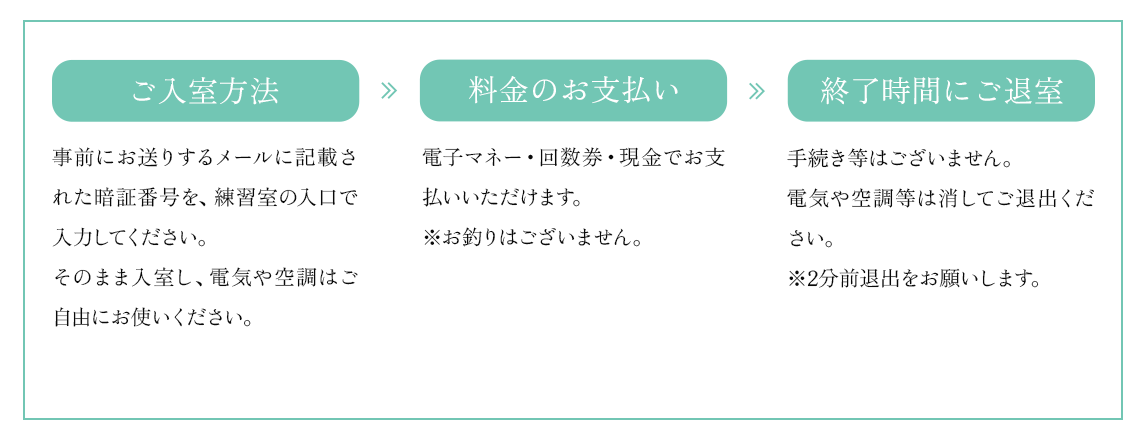 ※天井(約175cm)が低いため、バイオリンやフルート等、立奏には天満橋店の利用を推奨しております。